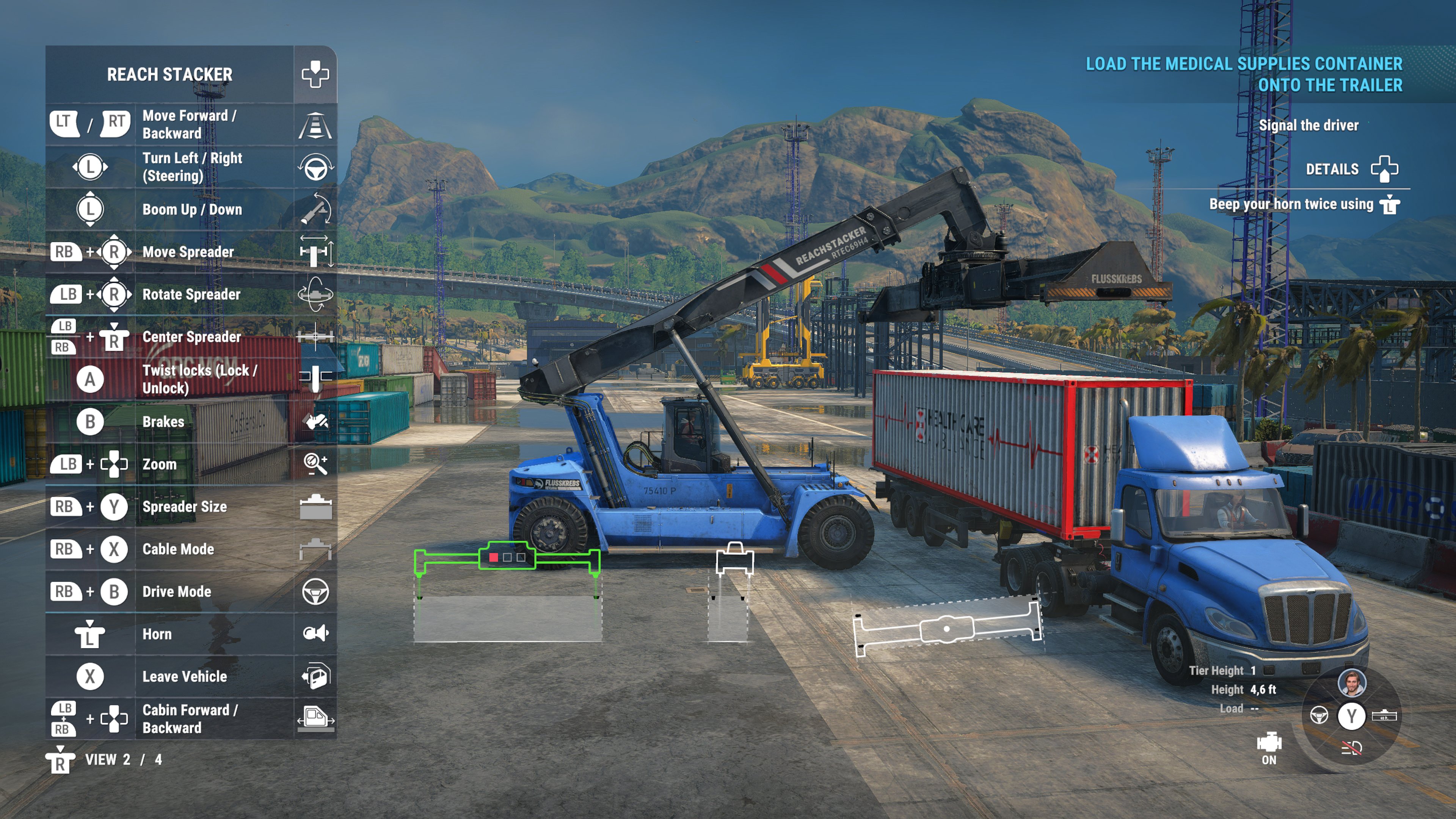 The UI can be rather intrusive, although you can usually select a camera that gives you a decent view of whatever particular action you need to perform (the various machines have anything between 2 and 4 camera views), and you can also temporarily remove the lengthy controls menu that consumes the left side of the screen by pressing up on the D-pad. Lining up the 'spreader' (the thing that attaches a container to the crane) is where skill is really required, but a 3 dimensional guide helps you line it up side-to-side (yaw), depthwise (front-to-back) and the angle–you can't always square up to a container, so fine adjustments are usually required. Saber have done a great job of simulating the delicate movements possible with the various vehicles, whether it's on a stormy sea or on uneven ground. The ‘cable mode’ means you can pick up oversize loads, irregularly shaped loads and even damaged containers, but loads swinging on the cables becomes an issue to deal with.