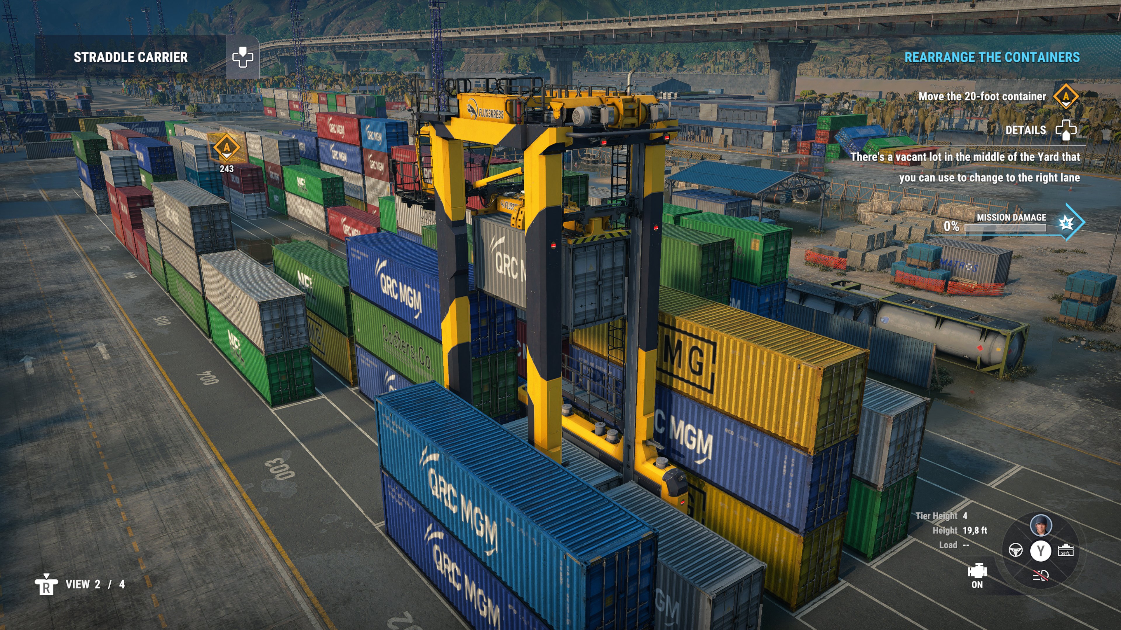 Each item transported has its own damage gauge, and if there are several they all accumulate, so you need to be careful–although not that careful. Some loads stress the lifting limits of the machines (crane's cables will snap, the Reach-Stacker will refuse to lift or overbalance), so you need to figure out how to put the minimum amount of strain on the machine.
