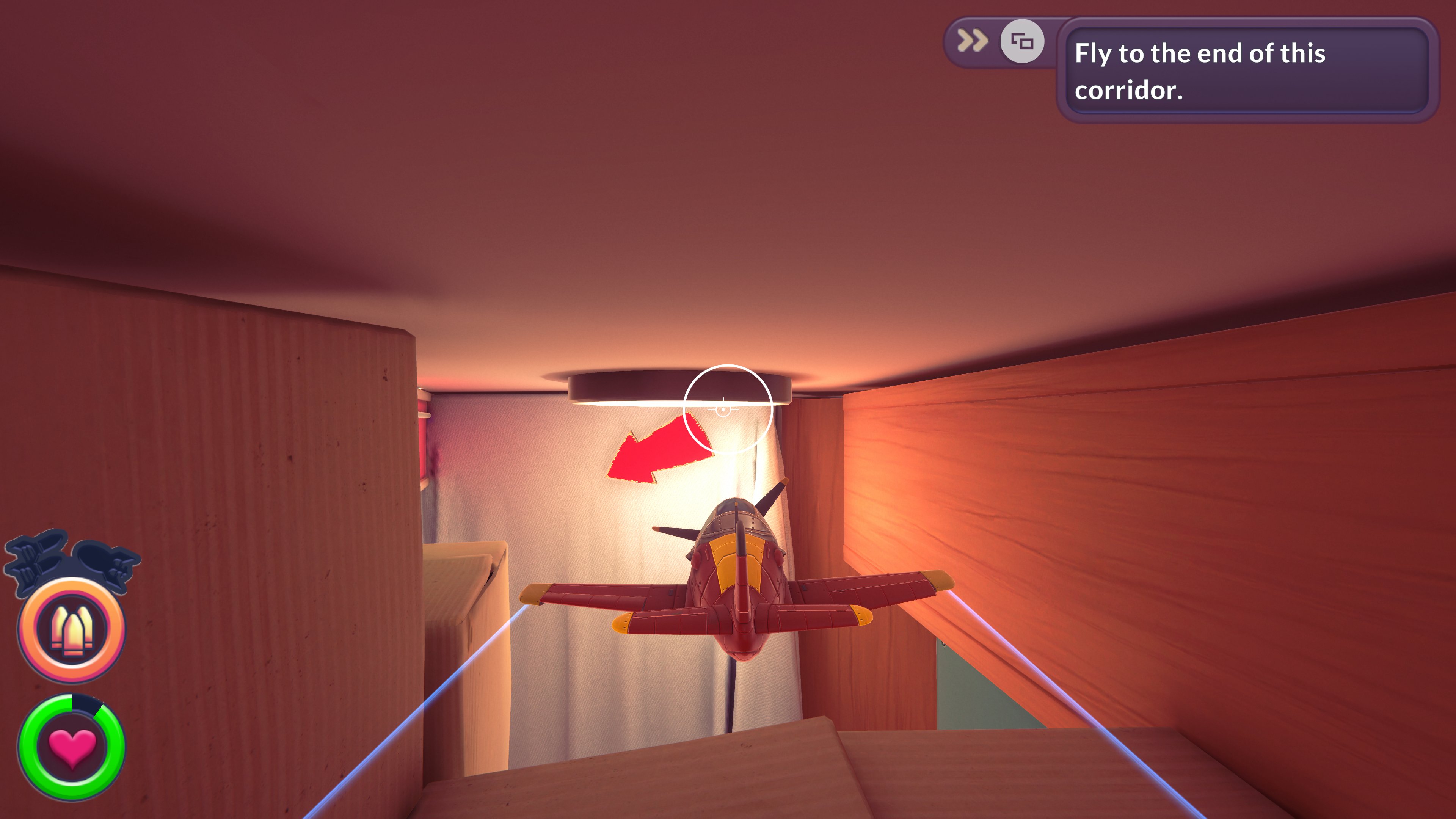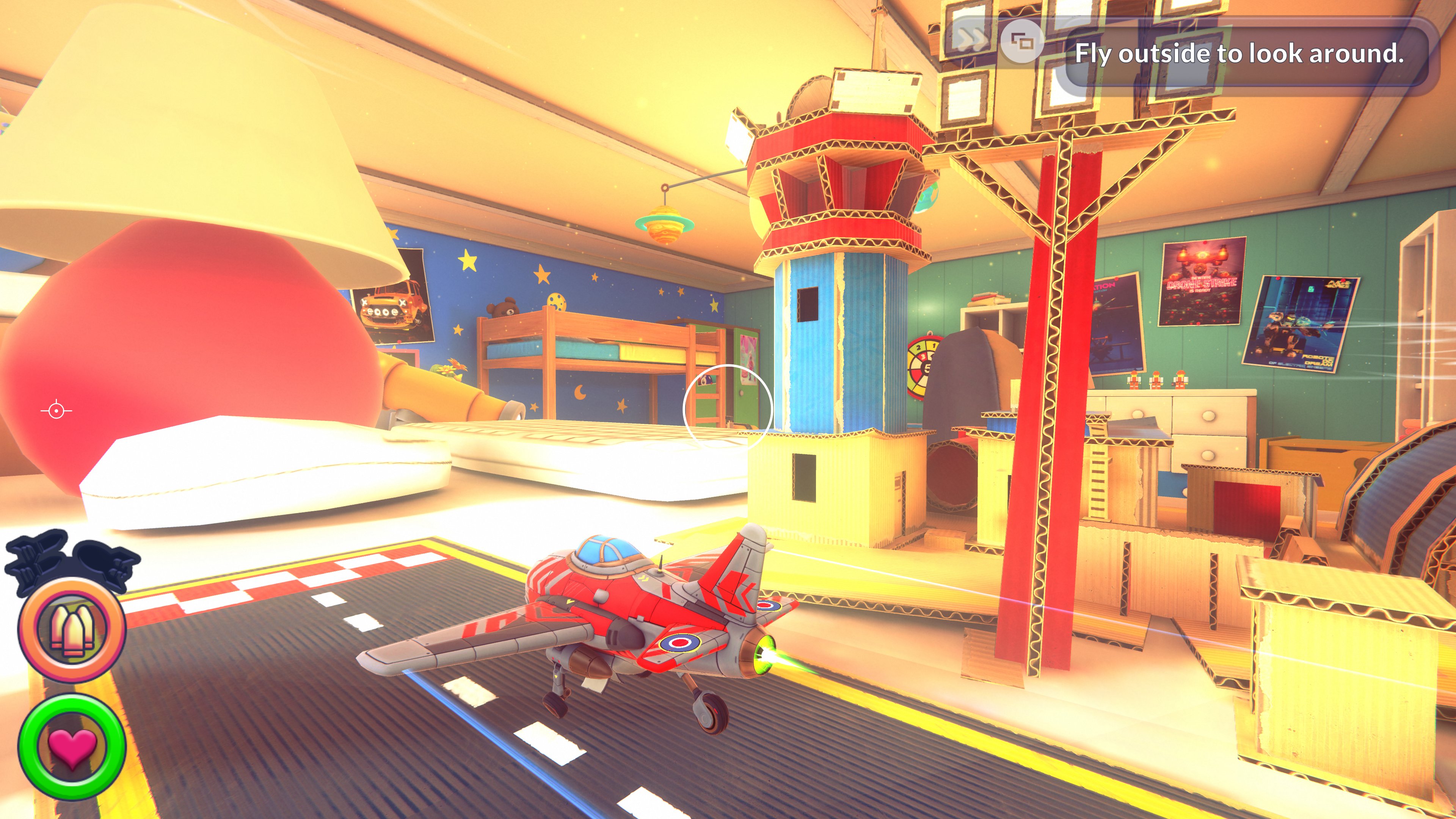 As with so many games of late, I have no idea who or what age group this game is aimed at, its PEGI 12 rating aims it straight at an age group that will quickly tire of its innocent setting with a remarkably unforgiving nature, and to put it bluntly, it's too damned hard for younger kids. It's a cute-looking toy-based game, indubitably influenced by Toy Story, set in an oversized world with Lego men, cuddly dinosaurs, teddy bears, plastic soldiers and a dolls house, but has dogfights tougher than many serious flight sims–mainly because the enemies are so aggressive and evasive, and your weapons are utterly crap. The cannon (even when you get to the upgraded planes) only fires rapidly for a couple of seconds before it needs to cool down or be replenished by flying through a pickup, the rockets are wimpy and only a direct hit will do any damage, and you can only carry one flippin' bomb at a time!
