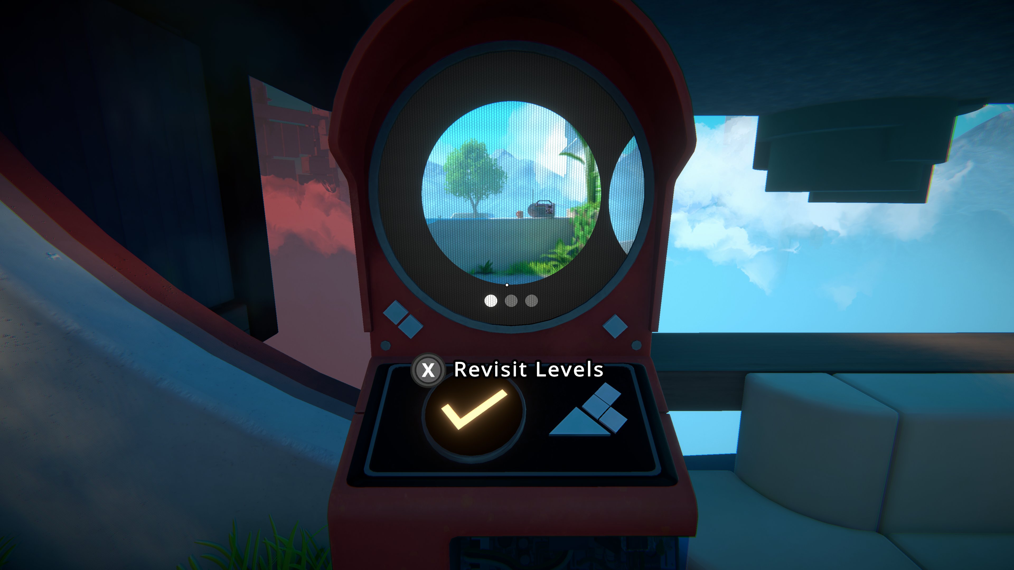 Apart from the puzzles, there's lots of sitting. Not sure why they made it possible to sit here, there, and everywhere in the game but you can. Perhaps it's easier to scratch your head at some of the trickier puzzles if you're sat, sitting. Viewfinder is, in the main, a very "chill" game, and only a few puzzles require speed of movement or thought (including a testing final level that requires that you use all of the tricks you've learned throughout the game.)